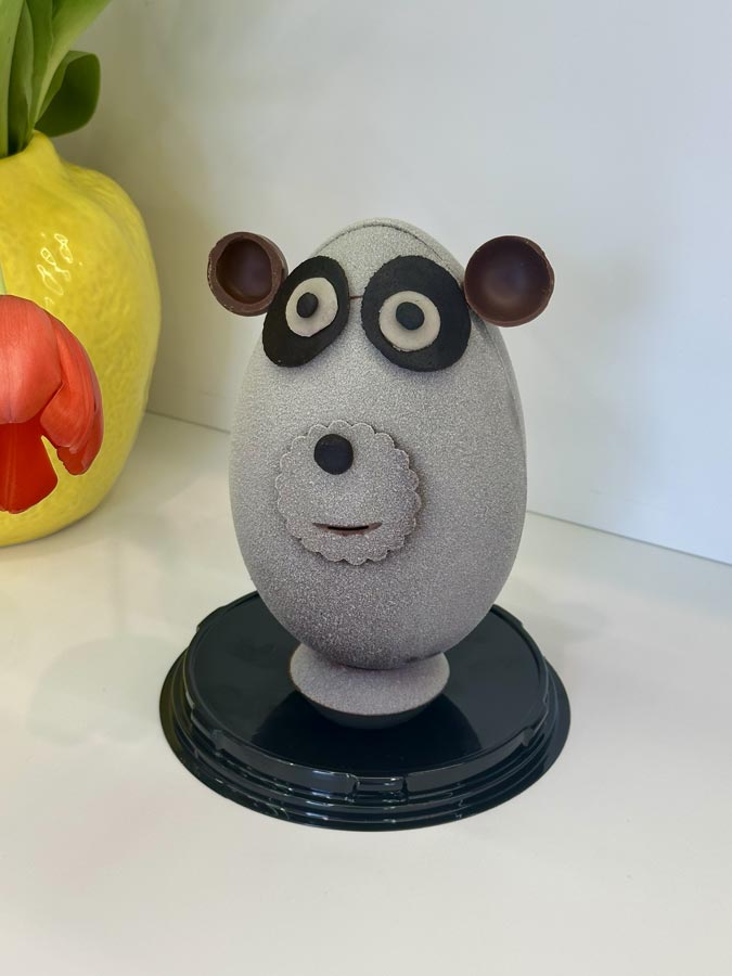 Au choix : chocolat noir 60% ou lait 43% garni de friture (lait, noir, blanc, dulcey). 310gr