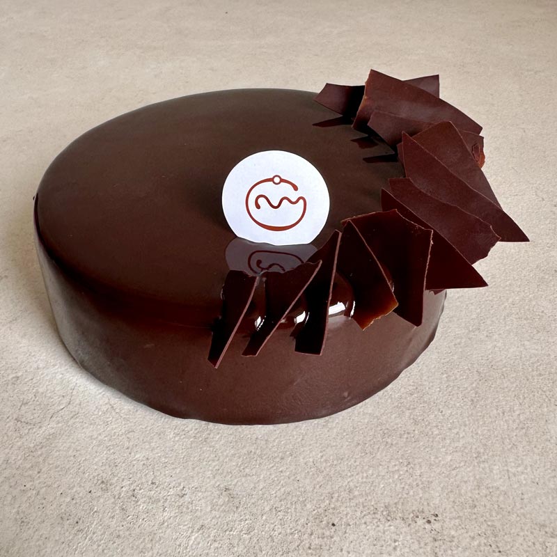 Crémeux caramel à la fleur de sel, croustillant praliné, biscuit chocolat et mousse chocolat "Sao Palmé" 60%.